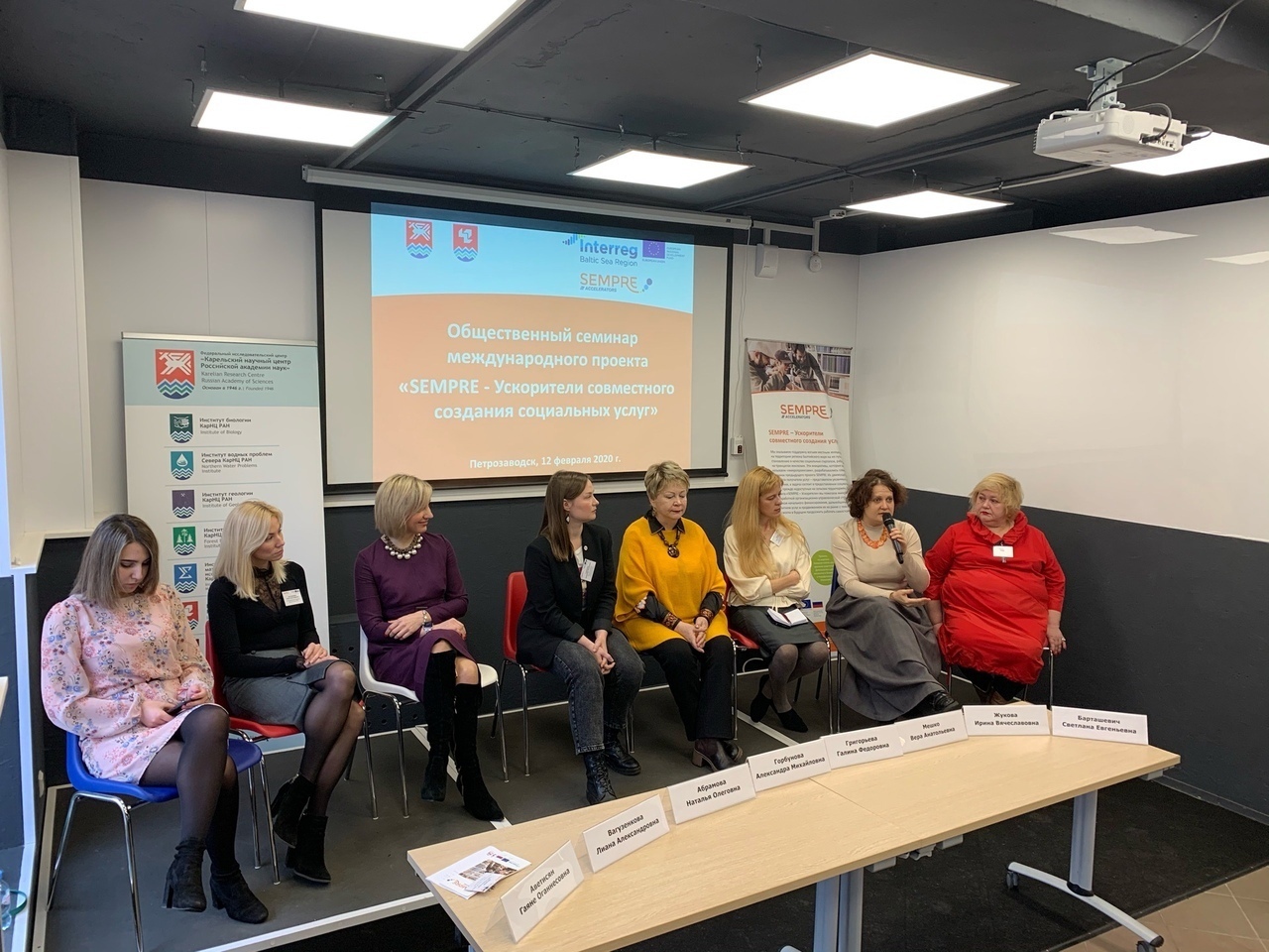 В рамках семинара уже состоялась презентация проекта «SEMPRE – Ускорители совместного создания услуг» и панельная дискуссия на тему «Активизация потребителей социальных услуг: перспективы и современное состояние». Во второй половине семинара пройдет презентация методов проекта «SEMPRE – Ускорители совместного создания услуг» и форсайт-сессия «Методы вовлечения потребителей в формирование социальных услуг в районах Карелии».