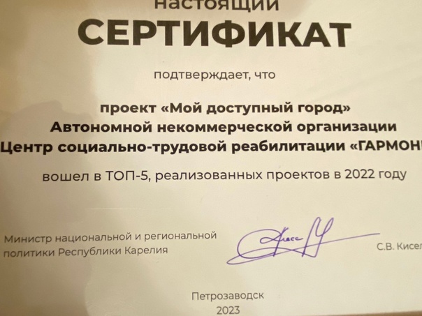 Проект: "Мой доступный город" нашей организации по озвучиванию светофорных объектов в г. Петрозаводске. Также: вручение сертификатов победителям Первого конкурсного отбора 2023 года, проводимого Фондом грантов Главы Республики Карелия. АНО "Гармония" за проект "Мастерская тактильных пособий"-по созданию тактильных книг и тактильных пособий для детей с ОВЗ.
