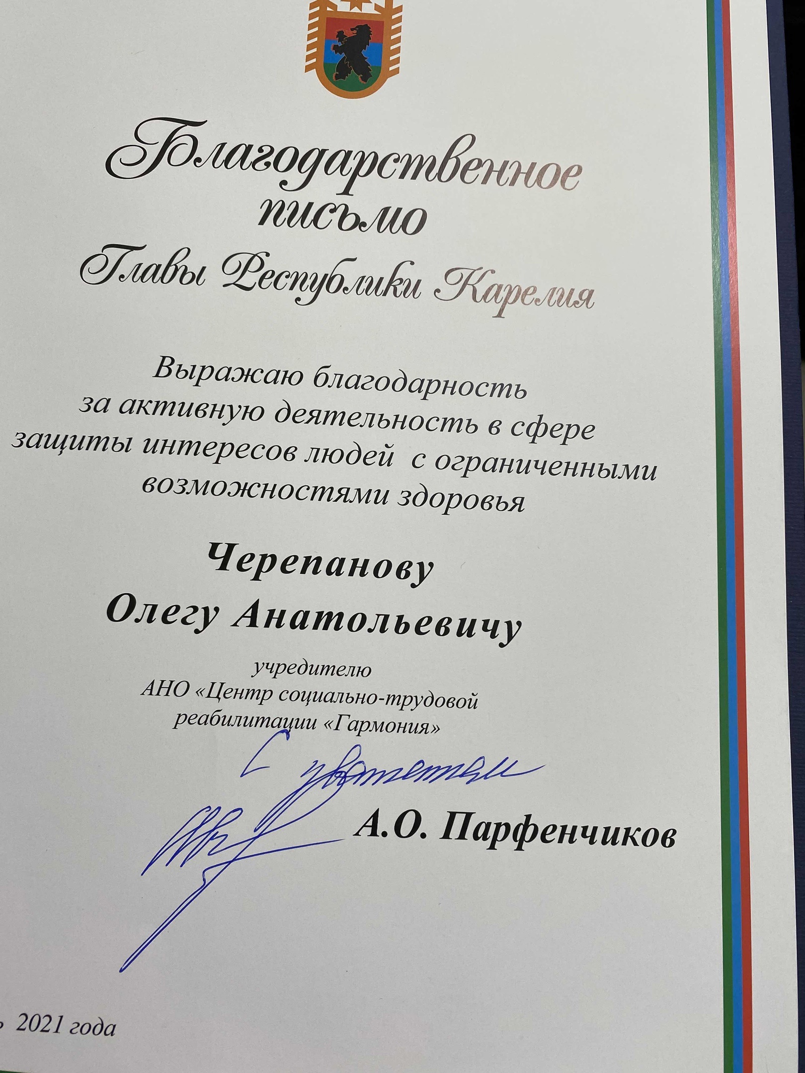 Сегодня, на расширенном совместном заседании коллегии Министерства социальной защиты Республики Карелия и Общественного совета при Министерстве социальной защиты заместитель Премьер-министра Правительства Республики Карелия по социальным вопросам Подсадник Лариса Анатольевна вручила благодарственное письмо Главы Республики Карелия учредителю нашей организации Черепанову Олегу Анатольевичу за активную деятельность в сфере защиты интересов людей с ограниченными возможностями здоровья! Поздравляем !!!
